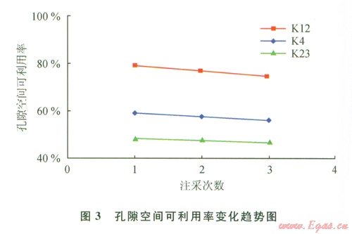 利用各輪氣、水互驅(qū)的束縛水、殘余氣飽和度,計(jì)算各類儲層巖心孔隙空間可利用率,結(jié)果見圖3。經(jīng)3輪氣、水互驅(qū),各類儲層孔隙空間可利用率的差距較為明顯,高、中、低滲率層孔隙空間可利用率分別為46.5%、56.0%、74.0%,并且隨著氣、水互驅(qū)輪次的增加,儲層孔隙空間可利用率表現(xiàn)為下降趨勢。其中低滲透率層孔隙空間可利用率下降幅度較大,表明由于孔喉發(fā)育較差,低滲透率儲層孔隙空間動(dòng)用能力受水驅(qū)效果影響更加明顯。