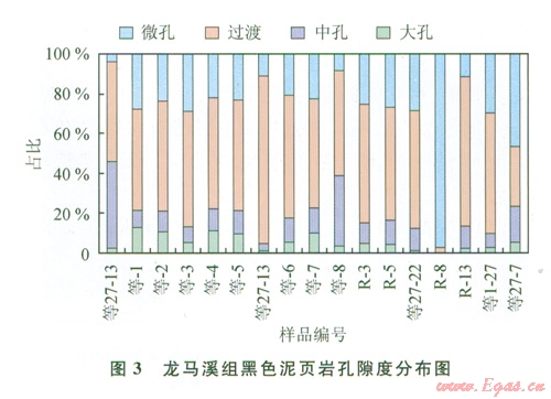 研究結(jié)果發(fā)現(xiàn),下志留統(tǒng)龍馬溪組頁(yè)巖樣品中大孔所占比例介于1.1%~12.9%,平均為5.7%;中孔所占比例介于3.5%~43.4%,平均為13.8%;過(guò)渡孔所占比例介于30.1%~83.9%,平均為57.68%;微孔所占比例介于3.9%~46.7%,平均為22.82%;空隙以過(guò)渡孔為主(圖3),微孔次之,兩種空隙合計(jì)所占比例介于61.4%~90.4%,平均為72.79%。
