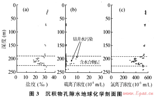 地球化學(xué)識別主要基于海底淺表層沉積物、沉積物中的自生礦物及底水的綜合分析和研究。淺層沉積物和底層海水的甲烷濃度異常高,通過對烴類氣體運(yùn)移路徑的追蹤可以間接識別和評價天然氣水合物;淺層沉積物孔隙水含量和異常是識別水合物層的依據(jù),一般來說,含天然氣水合物的沉積層的孔隙水鹽度和氯度會降低(圖3)。其次孔隙水中的氧化-還原電位和硫酸鹽含量的降低也可能是天然氣水合物存在的標(biāo)志[8]。