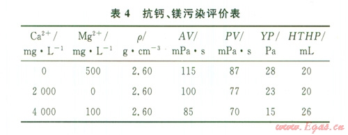 對可應(yīng)用于鹽膏層鉆井液來說,較強(qiáng)的抗鈣、鎂離子污染性能是其必須具備的基本性能。進(jìn)行了抗鈣、鎂污染評價,試驗(yàn)結(jié)果見表4。