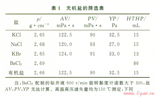 由表l數(shù)據(jù)可知:BaCl2與體系的配伍性差,加入BaCl2熱滾后體系明顯稠化、濾失增大;KBr價格較高;因此選用KCl、NaCl和有機(jī)鹽復(fù)配作為體系的抑制劑。