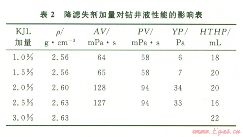 從表2可看出,KJl.加量低于2.0%時,熱滾后出現(xiàn)沉淀,KJL加量高于2.5%時,鉆井液黏切過高,從成本考慮,選用2.0%即可。