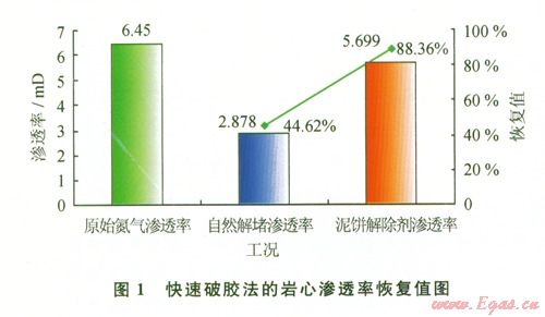完井后用破膠法清除水平井水平裸眼段的泥餅就保證了氣井的順利投產(chǎn)和良好的產(chǎn)能。破膠液配方使用:原用完井液+5%PF-HBK。破膠液接觸泥餅后,8h可使巖心滲透率恢復(fù)值大于80%(圖1),12 h后可達(dá)到95%。