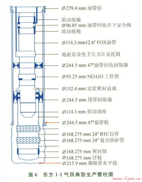 東方l-1氣田具有高產(chǎn)、C02含量較高的特點(diǎn)。作為中海油自營(yíng)開發(fā)的首個(gè)氣田在開發(fā)所面臨的最大問(wèn)題就是安全開發(fā)問(wèn)題。作為安全生產(chǎn)的第一屏障生產(chǎn)管柱結(jié)構(gòu)的設(shè)計(jì)選擇尤其重要。生產(chǎn)管柱的設(shè)計(jì)和下人須滿足低壓力損耗,使用壽命長(zhǎng),滿足氣藏動(dòng)態(tài)監(jiān)測(cè)的要求[2]。油管選用強(qiáng)度高、密封性好、內(nèi)孔平滑和可多次重復(fù)上扣l3Cr FOX油管。上部設(shè)計(jì)井下安全閥,保證氣井在緊急狀況下安全可靠關(guān)閉,及時(shí)切斷氣源。安全閥為全金屬密封(氣密封)。采用雙封隔器結(jié)構(gòu)保證安全生產(chǎn)的需要,增加封隔油套管環(huán)空的可靠性,降低完井作業(yè)返工率:第一密封由插人密封總成與防砂尾管懸掛封隔器組成,第二密封為油管回收封隔器。管柱底部用液壓剪切坐封球座,避免在大斜度井鋼絲作業(yè)坐封封隔器(圖6)。