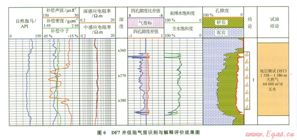 摘 要 鶯歌海盆地東方1-1氣田發(fā)現(xiàn)了眾多低阻氣層,其三孔隙度曲線“鏡像”不明顯,地層電阻率接近臨近水層和泥巖的值,難以有效識別。為此,從儲層巖性、孔隙結(jié)構(gòu)以及地層水性質(zhì)等方面對低阻氣層的成因機理進行了研究,在明確了低阻氣層成因的基礎(chǔ)上,提出了利用四孔隙度差值法、四孔隙度比值法對低阻氣層進行定性識別方法;依據(jù)導電效率模型對低阻氣層含水飽和度進行了計算,結(jié)合孔隙度與氣柱高度計算得到的束縛水飽和度,可以據(jù)此有效地對低阻氣層的產(chǎn)液性質(zhì)進行判斷。實際應(yīng)用結(jié)果表明,該方法在東方1-1氣田低阻氣層解釋評價中取得了良好的效果,與測試結(jié)果相吻合。