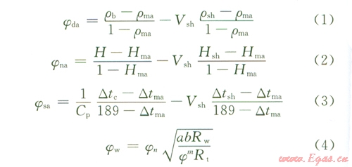 由泥質(zhì)砂巖體積模型可寫出地層流體為淡水時地層視密度孔隙度(φda)、視中子孔隙度(φna)、視聲波孔隙度(φsa)和含水孔隙度(φw),即
