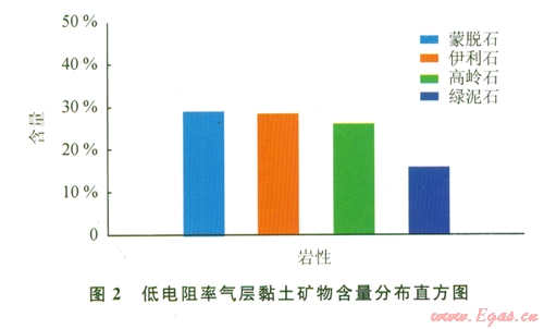 根據(jù)薄片鑒定分析和粒度分析資料,東方區(qū)塊低電阻率氣層巖性主要為由細-極細粒的石英粉砂和泥質(zhì)組成的泥質(zhì)粉砂巖。圖1為低阻氣層巖心粒度分析的黏土與粉砂含量分布直方圖,可見低阻氣層巖石顆粒成分主要為黏土與粉砂,二者之和約為80%。圖2為低阻氣層巖心X射線衍射分析得到的黏土礦物分布直方圖,由圖可見,低阻氣層的黏土礦物主要為蒙脫石與伊利石,兩者的含量總和達到60%。細顆粒巖性對儲層電阻率的影響主要體現(xiàn)在以下兩方面:①儲層中細顆粒成分越多,巖石的比表面積就會越大,顆粒表附大量的束縛水,增強巖石導電性;②小巖粒含量越高,地層中小孔隙和小喉道就越發(fā)育,使巖層中殘余水(束縛水)含量急劇升高,這又增強了巖石導電性,使地層電阻率下降。由此可見,巖性細是形成東方區(qū)塊部分氣層低電阻率特性的基本地質(zhì)環(huán)境[3-5]。