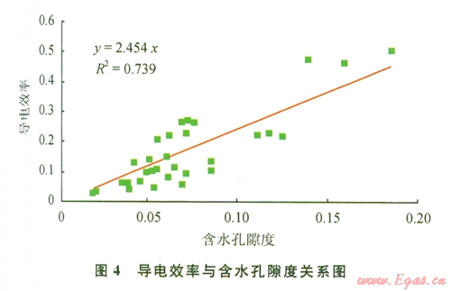利用上式計算低阻氣層含水飽和度,關(guān)鍵是確定式中的以a't值,高楚橋利用巖心巖電實驗結(jié)果剖析了導電效率(E)與含水孔隙度(φw)之間的關(guān)系[6-7],二者之間具有良好的線性關(guān)系,由此可以利用研究區(qū)地層溫壓條件下的巖電實驗結(jié)果求得式(7)中的a't值,見圖4。由此可知a't=2.454.
