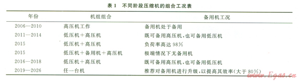 根據(jù)壓縮機的組合工況進行機組串聯(lián)、切換工藝設(shè)計。機組切換、串聯(lián)時上級壓縮機組會對下一級機組產(chǎn)生巨大的沖擊,為此,利用機組喘振工藝,修改了濕氣壓縮機軟件,使用入口旋流分離器和出口海水冷卻器,通過喘振閥形成小循環(huán)把機組運轉(zhuǎn)起來,實施精確控制,以實現(xiàn)多機組的切換和串聯(lián)運行。不同階段壓縮機的組合工況見表l。