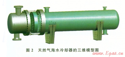 天然氣經(jīng)過濕氣壓縮機強力壓縮后,溫度升高,進入下一道工藝流程前需要進行冷卻降溫。天然氣海水冷卻器是利用清潔、環(huán)保、廉價的海水來冷卻天然氣的管殼式換熱裝置(圖2),采用管內(nèi)和管外單相強制對流換熱理論研制而成,是典型的間壁式換熱裝置。海水冷卻器受壓部件工作在海水和含C02濕天然氣的腐蝕環(huán)境中,所以,其良好的耐蝕性、抗振性和經(jīng)濟性是產(chǎn)品研制的關(guān)鍵技術(shù)問題。