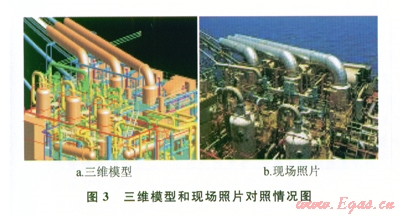 1)采用三維設(shè)計軟件PDMS搭建1:1的設(shè)備、結(jié)構(gòu)和管線模型。東方1-1氣田二期開發(fā)工程項目濕氣壓縮機工程引進三維設(shè)計軟件PDMS,在項目的設(shè)計中避免了很多大尺寸管線、設(shè)備、支架的碰撞問題,方便指導(dǎo)項目施工作業(yè)。三維模型和現(xiàn)場照片對照情況見圖3。