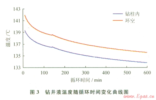 由圖3可知,鉆井液溫度隨循環(huán)時間的增加逐漸降低。當(dāng)循環(huán)時間約140 min時,鉆柱內(nèi)和環(huán)空鉆井液溫度出現(xiàn)拐點,這是由鉆井液和地層問熱傳遞發(fā)生交換造成的。