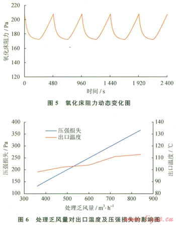 圖8描述的是換向半周期與氧化床壓強(qiáng)損失及出口溫度之間的關(guān)系(乏風(fēng)量為