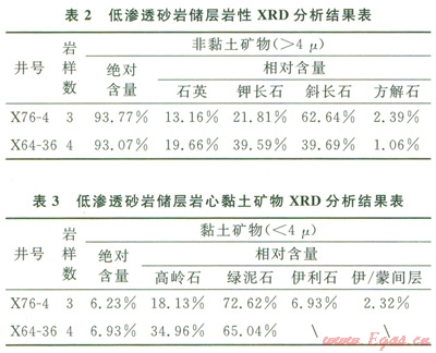 首先對實驗巖心樣品進(jìn)行XRD分析,其結(jié)果見表2、3??梢钥闯觯簬r石骨架部分以長石為主,石英含量次之;黏土礦物含量較少,以綠泥石為主,綠泥石含量在50.0%~75.30%之間。