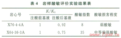 依據(jù)《儲層敏感性流動實驗評價方法》(SY/T 5358—2002)中酸敏評價實驗方法對巖心樣進(jìn)行了鹽酸敏感性評價實驗。實驗導(dǎo)致巖心滲透率發(fā)生不同程度地降低,結(jié)果呈現(xiàn)出一定的酸敏損害程度,表現(xiàn)為弱—中酸敏,其結(jié)果見表4。