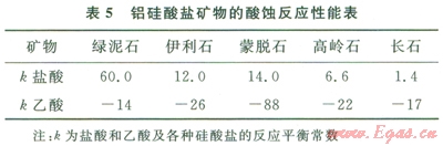 有學(xué)者研究了鹽酸與各種鋁硅酸鹽礦物的反應(yīng)動力學(xué),并將反應(yīng)速度常數(shù)的對數(shù)值為50時對應(yīng)的溫度(T50)作為各種鋁硅酸鹽在鹽酸中保持穩(wěn)定的溫度上限,各種鋁硅酸鹽的T50值如表5所示。表5同時也給出了根據(jù)熱力學(xué)數(shù)據(jù)計算出來的鹽酸與醋酸與各種鋁硅酸鹽礦物反應(yīng)的平衡常數(shù)??梢钥闯?,在熱力學(xué)上,這些鋁硅酸鹽均可以溶于鹽酸,但幾乎完全不溶于醋酸;而在動力學(xué)上,沸石在鹽酸中最不穩(wěn)定,綠泥石次之,長石最穩(wěn)定。在儲層中占優(yōu)勢的鋁硅酸鹽礦物的T50低于儲層溫度時,應(yīng)該考慮在酸化液中用乙酸代替鹽酸[6-8]。