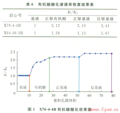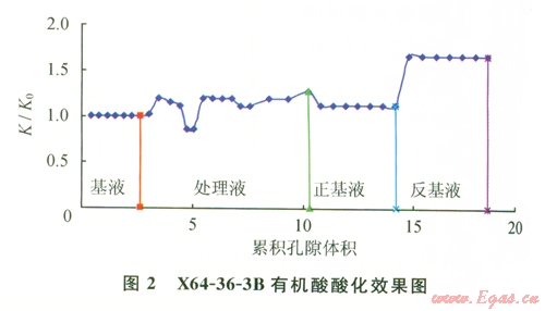 可以看出,采用用有機(jī)酸酸化后,巖樣的滲透率有了明顯的提高。說明酸液配方的選擇對酸敏實驗結(jié)果可產(chǎn)生“質(zhì)變”的影響[9-11]。