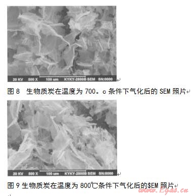 生物質炭在蒸汽作用下發(fā)生氣化,其微觀結構也會發(fā)生變化。使用掃描電子顯微鏡(SEM)對不同溫度下,生物質炭經過蒸汽氣化后的微觀結構進行研究。生物質炭在溫度分別為500、600、700和800℃條件下氣化后的SEM照片分別見圖6~9。
