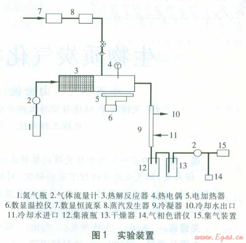 實驗裝置見圖l,該系統(tǒng)包括熱解反應器、蒸汽發(fā)生器、熱解氣冷卻裝置、檢測系統(tǒng)等。熱解反應器為長450 mm、內直徑為70 mm的不銹鋼圓柱體。熱解反應器左端長200 mm的區(qū)域為材料存放區(qū),右端長200 mm的區(qū)域為生物質熱解區(qū),50 mm長的中間問隔是為了減輕材料的預熱解。生物質熱解區(qū)由獨立的電加熱器加熱,加熱功率為1.5 kW,溫度由K型熱電偶測量,并由數顯溫控儀進行控制。熱解反應器后接1個長度為300 mm的冷凝器,用以分離可凝結相和氣體。實驗裝置設置保溫層,氣體管道采用電加熱的方式保溫,溫度設定為300℃,主要是為了防止可凝結相凝結。水由數顯恒流泵送入蒸汽發(fā)生器,蒸汽由生物質熱解區(qū)最左端加入,其溫度由一個E型熱電偶測量,并由溫控器控制。