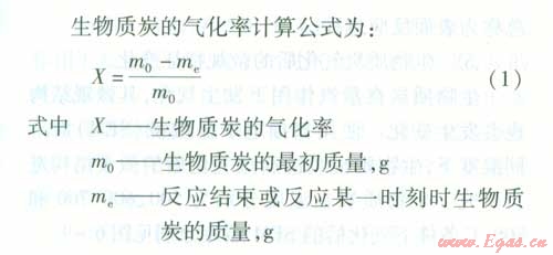 與煤焦和石油的氣化相比,針對生物質炭與蒸汽和C02的氣化研究還比較少。通過對國內外相關文獻的查閱可知,盡管有學者對生物質炭在蒸汽和C02條件下的氣化特性進行了一些研究,但是研究不夠深入,且主要針對以產氣為目的的生物質炭完全氣化過程,而對于生物質炭作為焦油催化劑時伴隨發(fā)生的氣化反應則沒有涉及[5-8]。筆者進行了生物質炭的氣化實驗,研究內容包括生物質炭的氣化率和氣化氣組成變化等,為研究生物質炭在催化重整過程中同時發(fā)生的生物質炭氣化反應奠定了基礎。