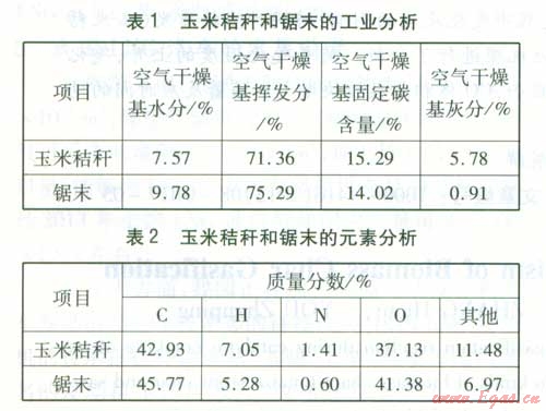 實驗所選材料分別為玉米秸稈和鋸末。玉米秸稈和鋸末均為常見的生物質原料,其低熱值分別為15.84、20.10 MJ/kgl 71,工業(yè)分析和元素分析分別見表1、2。
