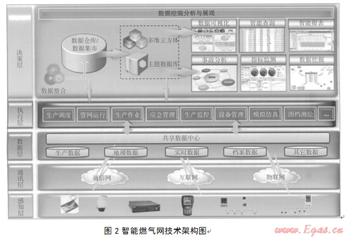 智能燃氣網(wǎng)是一個綜合的系統(tǒng)建設(shè)T程,它主要包括5個層次:物理感知層、網(wǎng)絡(luò)通訊層、共享數(shù)據(jù)層、運營執(zhí)行層、決策分析層。如圖2所示。