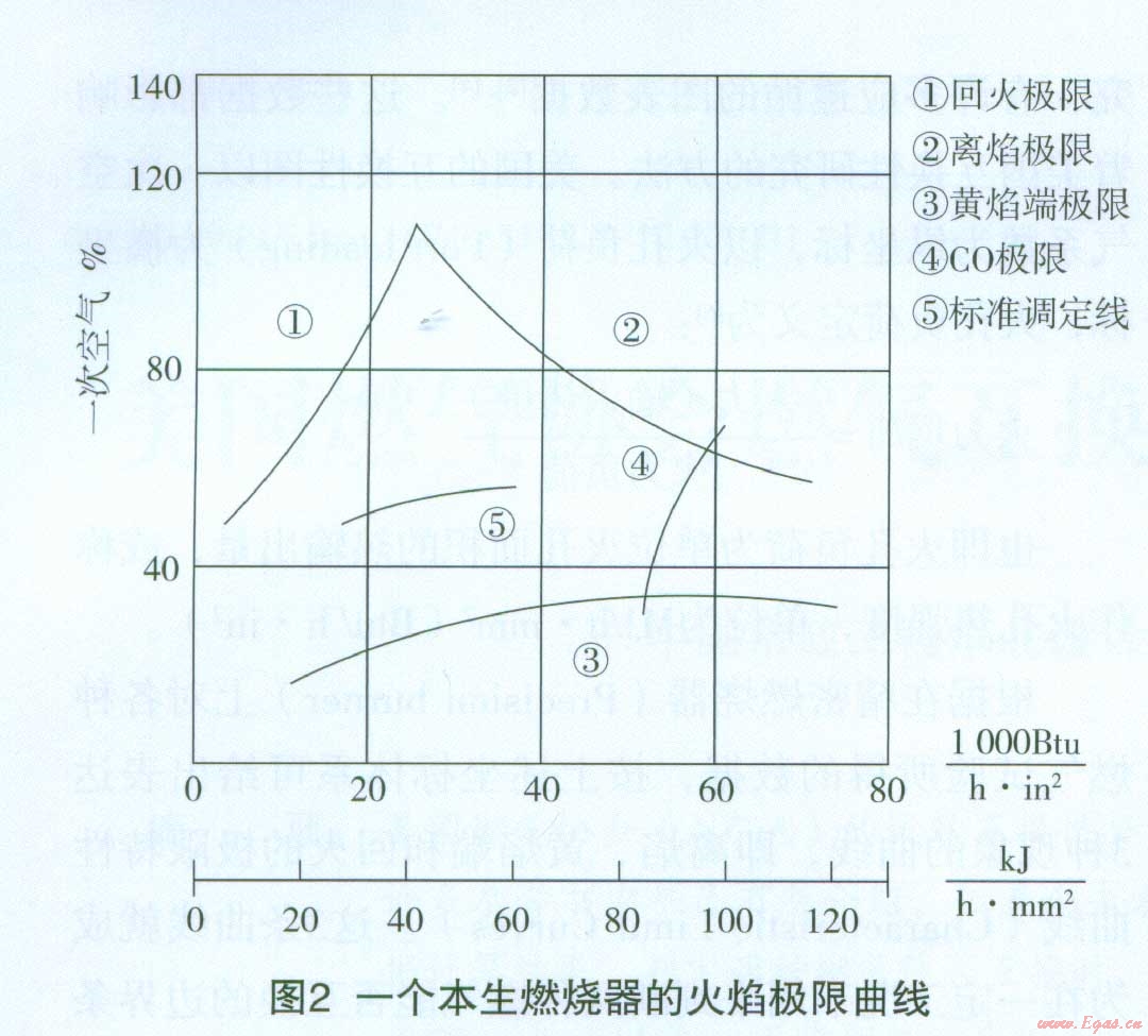 圖1中的中間范圍即燃具的設(shè)計(jì)范圍(DesighArea),也即滿意的運(yùn)行范圍(SatisfactoryoperatingArea)。圖2中的⑤表示標(biāo)準(zhǔn)調(diào)定線。極限值相當(dāng)于金屬材料試驗(yàn)中的屈服極限,滿意的運(yùn)行范圍或標(biāo)準(zhǔn)