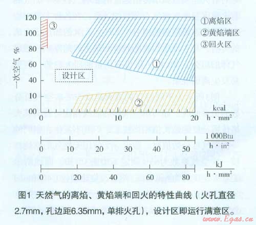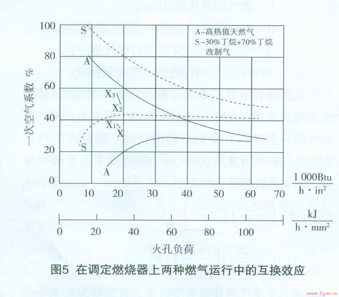 即圖4中置換后的工作點(diǎn)X3,就不會(huì)遇到離焰情況。從燃燒器的設(shè)計(jì)要求來看,對(duì)一次空氣系數(shù)就有規(guī)定的要求。以上只是從離焰曲線論離焰,不能認(rèn)為調(diào)整一次空氣系數(shù)就可解決燃?xì)獾幕Q問題。