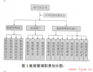 根據(jù)數(shù)據(jù)管理的目標(biāo)和主要工作內(nèi)容,油氣田公司應(yīng)對(duì)數(shù)據(jù)管理工作的具體角色和職責(zé)進(jìn)行劃分口l(圖3)。組織是數(shù)據(jù)管理體系中最重要的部分之一,是保證體系正常運(yùn)行的核心。結(jié)合各相關(guān)單位業(yè)務(wù)分工,理順數(shù)據(jù)管理各相關(guān)部門之間關(guān)系十分重要。
