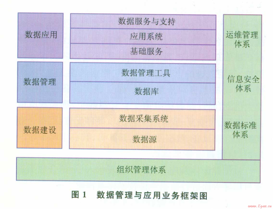 圖1中包含了數(shù)據(jù)業(yè)務(wù)體系和基礎(chǔ)保障體系。其中基礎(chǔ)保障體系包括:①組織體系,油氣田公司數(shù)據(jù)管理與應(yīng)用的組織體系建設(shè)分為決策層、領(lǐng)導(dǎo)層、管理層和執(zhí)行層4個(gè)層次;②標(biāo)準(zhǔn)體系,信息標(biāo)準(zhǔn)體系是技術(shù)體系中重要的組成部分,有2層含義,一是業(yè)務(wù)層面的業(yè)務(wù)活動(dòng)、業(yè)務(wù)單元標(biāo)準(zhǔn)化,如井、地質(zhì)構(gòu)造命名,油氣生產(chǎn)流程等,二是計(jì)算機(jī)層面的元數(shù)據(jù)標(biāo)準(zhǔn)化;③安全體系,信息安全系統(tǒng)中各個(gè)安全組件或要素只有整合成一個(gè)整體協(xié)同作用時(shí),才能有效保證企業(yè)整體安全管控的目標(biāo)得以實(shí)現(xiàn)。油氣田公司信息安全框架為油氣田公司提供一個(gè)全面的、基于信息安全建設(shè)最佳實(shí)踐的、結(jié)合了業(yè)界相關(guān)開放標(biāo)準(zhǔn)的安全模型口3;④運(yùn)維體系,合理地建立與完善運(yùn)行維護(hù)體系,保障在用信息系統(tǒng)的正常運(yùn)行,才能滿足油氣田科研、生產(chǎn)和管理業(yè)務(wù)活動(dòng)需求。