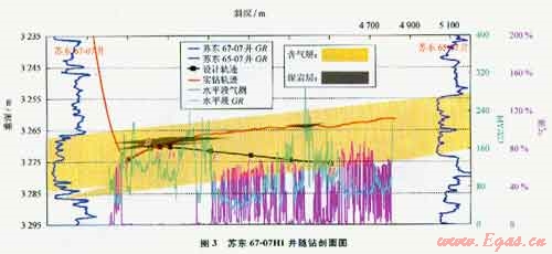 由于蘇里格氣田復(fù)雜的砂體疊置關(guān)系,常見以交錯(cuò)單砂體所引起的“假構(gòu)造”,因此,水平段地質(zhì)導(dǎo)向關(guān)鍵是對(duì)水平井部署區(qū)域目標(biāo)層“真假構(gòu)造”的識(shí)別。但無論是同一砂體真構(gòu)造,還是由不同砂體形成的假構(gòu)造,水平段施工都不應(yīng)過分注重設(shè)計(jì)構(gòu)造趨勢(shì)而忽視巖性變化,應(yīng)以“先追蹤砂體、后參考構(gòu)造”的原則靈活調(diào)整導(dǎo)向。以蘇里格氣田中區(qū)水平井施工為例,采取該導(dǎo)向方法取得了顯著效果,全年有5口井采取追蹤砂體導(dǎo)向而偏離設(shè)計(jì)井眼軌跡獲得成功,砂層鉆遇率明顯提高。典型井如蘇東67-07H1井,水平段末端與設(shè)計(jì)井眼軌跡偏差達(dá)11m,而砂層鉆遇率達(dá)到84.4%(圖3)。