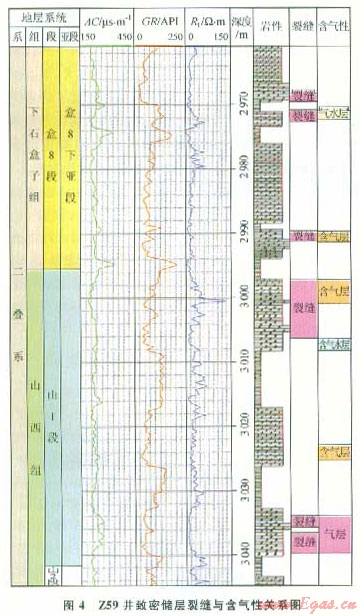 低滲透砂巖油氣藏滲流起主導(dǎo)作用的為宏觀裂縫系統(tǒng),而微觀裂縫主要是改善儲層的滲透性能。裂縫是低滲透砂巖儲層的主要滲流通道,控制了油氣藏的滲流系統(tǒng)[6]。研究區(qū)占主導(dǎo)地位的是構(gòu)造裂縫,裂縫是極好的運(yùn)移通道,是溝通孔洞、形成優(yōu)質(zhì)儲層的重要因素,對天然氣聚集成藏的重要影響。在裂縫較為發(fā)育的地區(qū)或?qū)佣?,尤其是對低孔、低滲的砂巖儲層而言,裂縫發(fā)育的層段,砂巖含氣性明顯好于一般的砂巖儲層,氣層、含氣層基本對應(yīng)于裂縫發(fā)育井段(圖4)。表明裂縫對儲層物性具有明顯的改善作用,是形成高產(chǎn)氣藏的重要條件。
