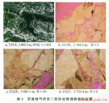 鑄體薄片、掃描電鏡中常見成巖裂縫,以溶蝕縫最常見(圖2),收縮縫和貼??p最少。研究區(qū)約30%的砂巖粒間孔具有溶蝕現(xiàn)象,在鏡下所見微孔隙直徑主要范圍在介于5~50μm,延伸范圍常超出視域,溶蝕裂縫形態(tài)多呈不規(guī)則彎曲狀,微裂縫可見分岔,溶蝕裂縫常溝通孔隙,改善儲層孔隙結(jié)構(gòu)。