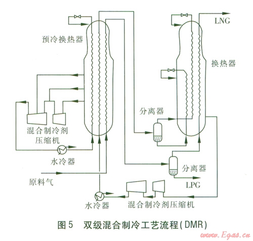 ③雙級(jí)混合制冷工藝(簡(jiǎn)稱DMR)。采用乙烷、丙烷與少量甲烷、丁烷混合物為預(yù)冷流程制冷劑,將天然氣從常溫預(yù)冷到