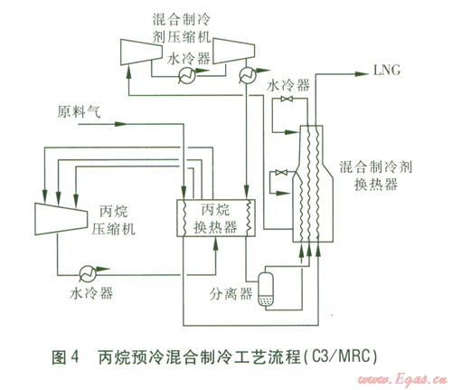②丙烷預(yù)冷混合制冷工藝流程(簡(jiǎn)稱C3/MRC)。天然氣先經(jīng)過(guò)丙烷預(yù)冷,然后用混合制冷劑進(jìn)一步冷卻并液化。低壓混合制冷劑經(jīng)兩級(jí)壓縮機(jī)壓縮后,先用水冷卻,然后流經(jīng)丙烷換熱器進(jìn)一步降溫至約