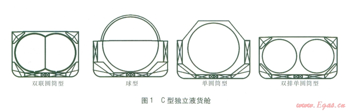 對于圖l所示的幾種C型獨立液貨艙,在貨物滿載時,球型和單圓筒型液貨艙的重心比雙聯(lián)圓筒型液貨艙高,故降低了船的穩(wěn)性,且由于球型和單圓筒型液貨艙直徑大,部分體積凸出主甲板以上,故增加了受風(fēng)面積,不利于操縱。就船體主甲板以下的艙容利用率而言,雙聯(lián)圓筒型液貨艙最高,單圓筒型液貨艙次之,雙排單圓筒型液貨艙最差。在同樣的船體主尺寸下,如采用雙排單圓筒型液貨艙,需要增加船寬以滿足布置要求。