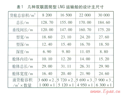 國內(nèi)外雙聯(lián)圓筒型LNG運輸船的設(shè)計主尺寸[15-16]見表l,支線LNG船的液貨艙尺寸即為表l中容積22