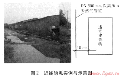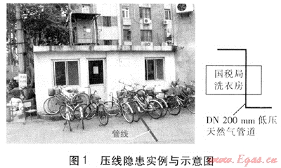 根據(jù)占壓形式的不同,管道占壓隱患又可以分為壓線隱患和近線隱患2類。壓線隱患是指建、構(gòu)筑物直接占壓在管道上方,占壓物邊界的投影在管道上方的隱患。近線隱患是指建、構(gòu)筑物邊界的投影在管道一側(cè),但管道與占壓物的水平凈距或垂直凈距不能滿足規(guī)范中的相關(guān)要求的隱患。壓線隱患、近線隱患實例見圖1、2。目前統(tǒng)計的695處管道占壓隱患中,壓線隱患有623處,占全部隱患的89.64%,近線隱患72處,占全部隱患的10.36%。