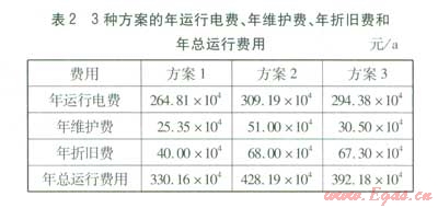 根據(jù)式(1)~(4)得出3種方案的年運(yùn)行電費(fèi)、年維護(hù)費(fèi)、年折舊費(fèi)和年總運(yùn)行費(fèi)用,見表2。