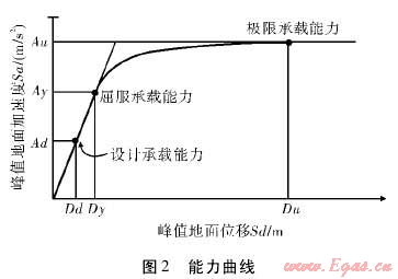 能力——需求譜分析方法的理論基礎為目前在抗震設計中廣泛采用的靜力彈塑性分析方法,即Push-over分析方法。建構(gòu)筑物在地震中的反應由能力曲線代表,該曲線反映了結(jié)構(gòu)受到地震橫向載荷與頂點位移關(guān)系曲線(能力譜)。再將地震波到達建構(gòu)筑物場地的反應譜轉(zhuǎn)化為需求譜,兩曲線的交點即性能點,作為建筑物在地震作用下的峰值位移或加速度。