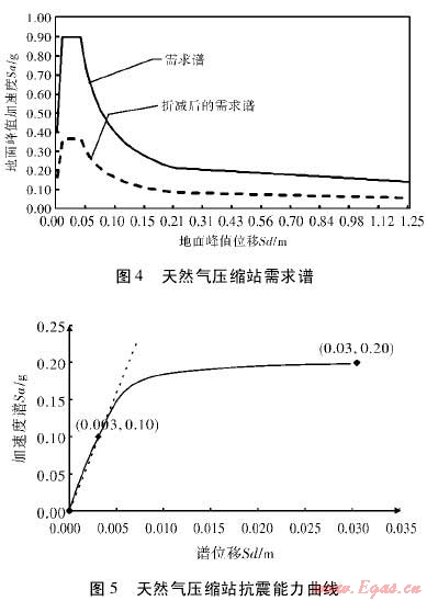 為了進一步得到該站抗震能力曲線。以圖2所示能力曲線為基本形狀,并依據(jù)HAZUS-MH對相關(guān)能力曲線參數(shù)進行設置。本例中屈服承載能力與極限承載能力兩個控制點相關(guān)參數(shù)設置如下:Cs為0.05,Te為0.35,α為0.75,γ為1.5,λ為2,μ為5。將以上參數(shù)代入能力譜控制點公式,得到該天然氣壓縮站抗震能力曲線如圖5所示。
