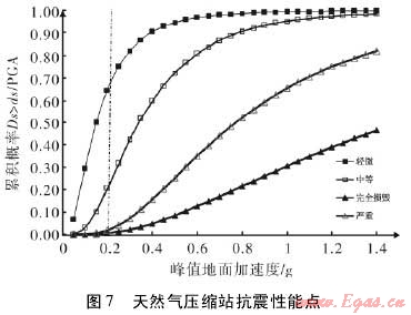 圖7所示脆弱性曲線,反映了該天然氣壓縮站四種破壞程度的概率值。由圖中任一條脆弱性曲線趨勢可以看出,隨著地震所導致的地面峰值加速度的加大,特定破壞程度的概率也在不斷的提高。并且當?shù)孛娣逯导铀俣戎迪嗤瑫r,壓縮站較低破壞程度的概率相對較高。最后,根據(jù)圖6中確定的性能點,可以得到當峰值地面加速度為0.2g時,對應的輕微破壞的概率約為0.65,而對應中等破壞的概率為0.2。至此,完成了在特定地震強度下該天然氣壓縮的脆弱性評估工作。