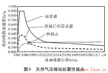 將天然氣壓縮站抗震能力曲線與需求譜繪制在同一坐標內(nèi),得到性能點,如圖6所示。可以看出,性能點對應的地面峰值加速度約為0.2g,地面峰值加速度約為0.07m。該性能點反映了天然氣壓縮站在本次地震中所能承受的極限值。