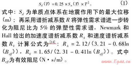 在建立以周期為橫坐標的加速度反應譜的基礎上,將其轉(zhuǎn)換為加速度與位移關(guān)系的需求譜,Sa與Sd之間的轉(zhuǎn)換關(guān)系為[14]: