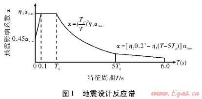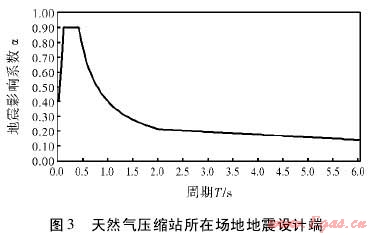 根據(jù)規(guī)范要求,采用如圖1形式的設計反應譜。反應譜相關(guān)參數(shù)設置如下:水平地震影響系數(shù)最大值為0.9,特征周期值為0.4s,建筑結(jié)構(gòu)的阻尼比取0.05,地震影響系數(shù)曲線的阻尼調(diào)整系數(shù)為1.0,曲線下降段自特征周期至5倍特征周期區(qū)段的衰減指數(shù)取0.9。直線下降段自5倍特征周期至6s區(qū)段下降斜率調(diào)整系數(shù)取0.02。通過計算,得到天然氣壓縮站所在場地地震設計譜如圖3所示。以該反應譜作為該天然氣壓縮站所在場地的地震潛在危險。