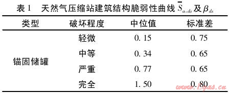 由于我國缺少燃氣壓縮站脆弱性曲線相關(guān)數(shù)據(jù),這里依據(jù)HAZUS中建議采用相關(guān)參數(shù),如表1所示,擬合出的天然氣壓縮站的脆弱性曲線,如圖7所示。