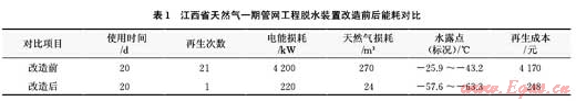 脫水裝置再生工藝流程由雙塔開式循環(huán)改造為單塔閉式減壓循環(huán)后,解決了由于再生飽和濕氣與工藝來(lái)氣存在交匯點(diǎn),致使冷凝出的水合物大量積聚在前置過濾器中,導(dǎo)致工藝來(lái)氣在進(jìn)入到吸附塔前含水量陡增的問題。改造后的脫水裝置較改造前吸附能力顯著提升,再生頻率大幅降低。與此同時(shí),減少了再生過程中天然氣和電能的損耗,節(jié)能效果較為顯著。以目前江西省天然氣一期管網(wǎng)工程加氣母站年產(chǎn)量計(jì)算,每年可節(jié)省約10×104元的生產(chǎn)成本(表1)。