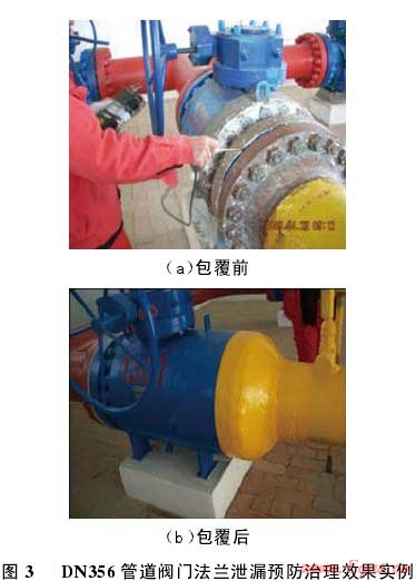 泄漏,然后按照上述施工流程對法蘭進(jìn)行碳纖維復(fù)合材料堵漏加固處理,待復(fù)合材料養(yǎng)護(hù)固化后,進(jìn)行耐壓密封試驗。結(jié)果表明:采用碳纖維復(fù)合材料進(jìn)行管道法蘭滲漏治理,管道系統(tǒng)連接法蘭在 10 MPa 介質(zhì)壓力下,露天環(huán)境下穩(wěn)壓 14 d,堵漏區(qū)域無任何泄漏??梢?,該套技術(shù)方案對存在泄漏隱患的管道法蘭泄漏治理非常有效。由于該套技術(shù)方案具有作業(yè)不動火、操作安全、成本費(fèi)用低等特點,2008-2011年,采用復(fù)合材料修復(fù)技術(shù)對西氣東輸全線 220 多個線路閥室旁通管道 DN356 閥門連接法蘭及各站場與干線連接的DN50 和 DN80 管道法蘭泄漏隱患進(jìn)行治理(圖 3),在確保管道安全平穩(wěn)運(yùn)行的同時,節(jié)約了大量維修費(fèi)用。復(fù)合材料修復(fù)對法蘭結(jié)構(gòu)具有一定的加固作用,可提高法蘭的抗軸向拉伸、彎曲能力,防止密封面泄漏情況進(jìn)一步惡化。但是,對于已經(jīng)出現(xiàn)明顯泄漏的高壓(7 MPa 以上)法蘭,治理效果不佳。