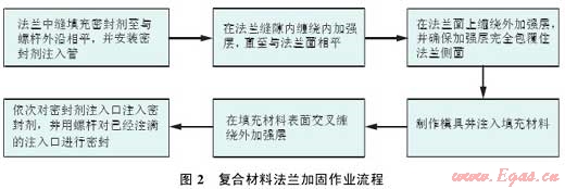 基本原理:對連接法蘭面間隙填充高強(qiáng)度堵漏密封材料,再用由高強(qiáng)度纖維與環(huán)氧粘結(jié)劑組成的復(fù)合材料對法蘭連接部位進(jìn)行整體外包覆,待復(fù)合材料結(jié)構(gòu)固化后,形成一個高強(qiáng)度殼體結(jié)構(gòu),實現(xiàn)整體加固,達(dá)到預(yù)防法蘭泄漏的目的(圖 2)。