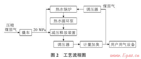 2) 熱水循環(huán)系統(tǒng)。熱水循環(huán)系統(tǒng)的主要設(shè)備是熱水鍋爐、熱水泵、電子水處理器、除污器等,負責(zé)向 CNG 減壓釋放裝置中的換熱設(shè)備提供循環(huán)熱水以保證系統(tǒng)的正常工作。調(diào)壓后的煤層氣作為熱水鍋爐的燃料。